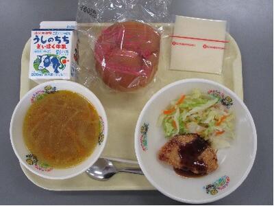 今日は給食室で一枚一枚手作りした「ハムカツ」です。丁寧にバッター液とパン粉をつけて揚げました。スライスチーズもあるので、こどもパンにハムカツとスライスチーズ、野菜を挟んで食べてもおいしいです。自分たちで決めることができて、食の選択の練習にもなります。「ジュリエンヌスープ」は千切りにした野菜が入ったスープです。野菜のうまみがたっぷり入ったスープになっていますよ。