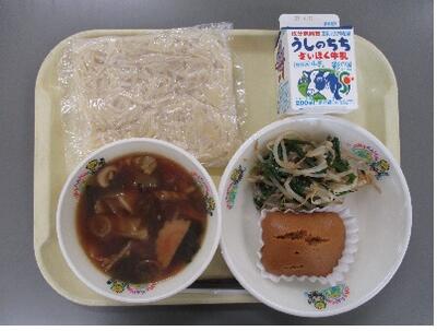 今日は、今年度では初めての麺の日です。人気メニューの「しょうゆラーメン」です。また、給食室自慢の手作り「黒糖蒸しパン」です。黒糖はミネラルも含んでいて、コクのある深い甘さと独特の風味があります。朝から調理員さん総出で一生懸命作りました。