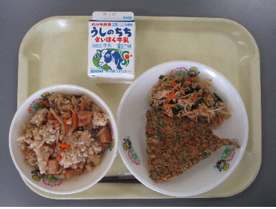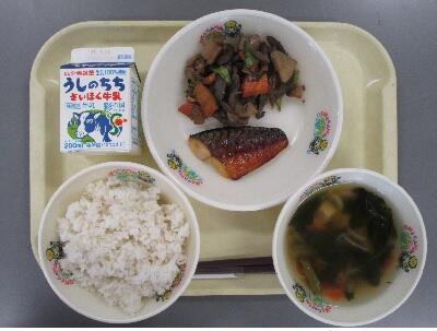 給食では毎月19日前後に「和食の日」として、ごはん、おかず、汁物がそろった献立を出しています。ごはんは、昔から食べられてきた食べ物で、たんすいかぶつを豊富に含むため、脳や体のエネルギー源としてとても大切です。また、粒のまま食べるので消化吸収がゆっくりと行われ、満腹感が長持ちするため、肥満予防にも良いと言われています。