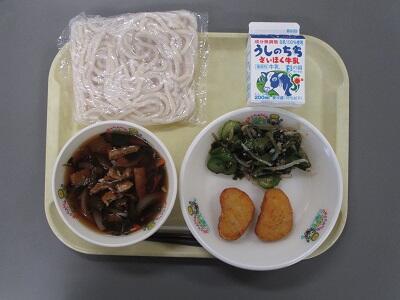 今日は、桶川市でとれた紅花若菜を使ったごま酢あえです。紅花若菜は小松菜と同じ栄養が含まれています。少し苦味もありますが、ごまと一緒にあえることで苦味をなくしています。シャキシャキとした食感が楽しめます。地元の農家さんが給食のために、愛情たっぷりに育ててくれました。